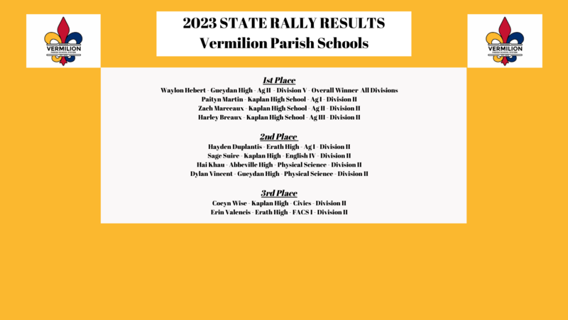 Congrats to all of the following students who placed in the top three at the Louisiana State Rally held earlier this month in Baton Rouge. A great accomplishment by all.